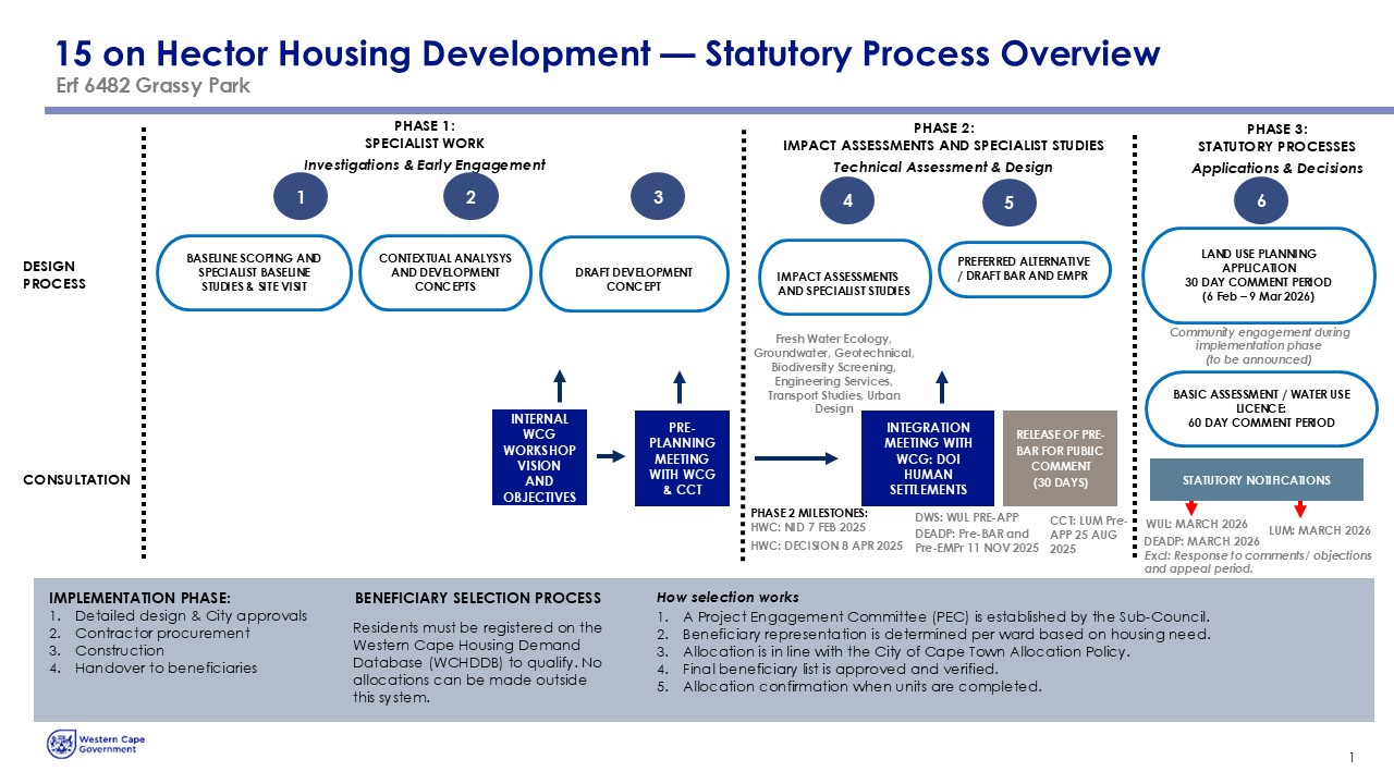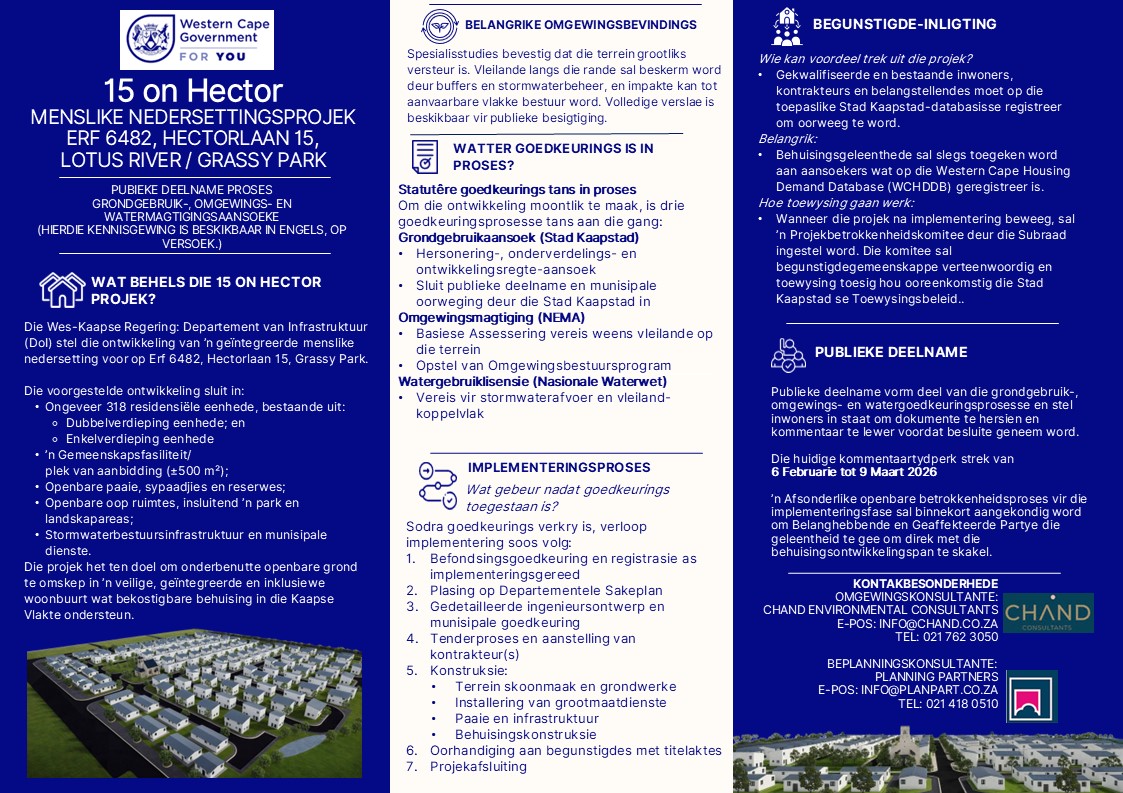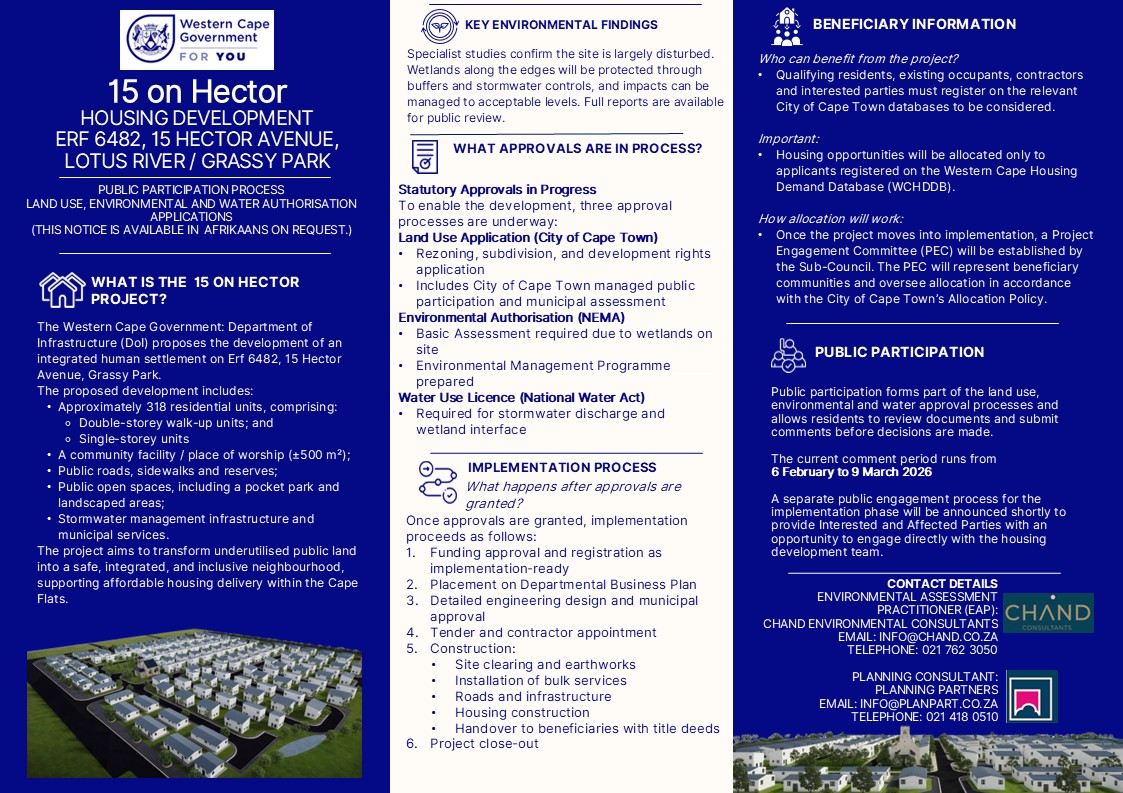 NOTIFICATION OF PUBLIC PARTICIPATION PROCESS AND AVAILABILITY OF THE BASIC ASSESSMENT REPORT AND WATER USE LICENCE SUMMARY REPORT FOR THE PROPOSED 15 ON HECTOR AFFORDABLE HOUSING DEVELOPMENT ON ERF 6482, LOTUS RIVER, CAPE TOWN