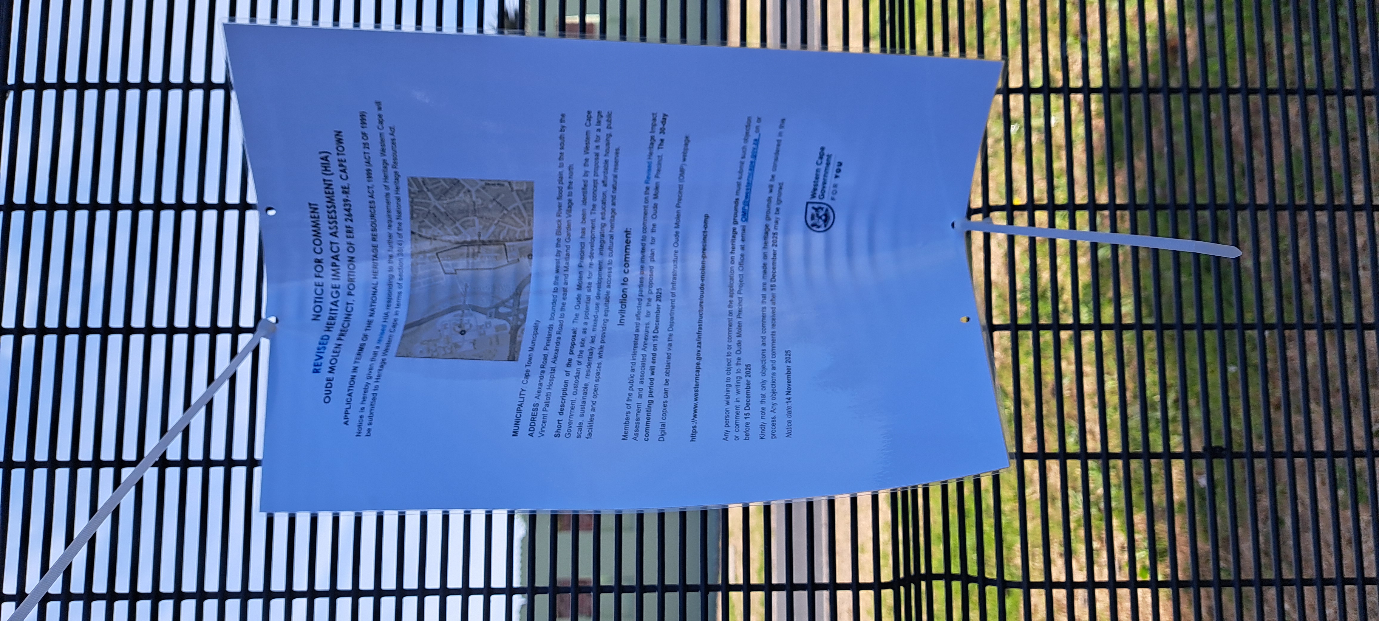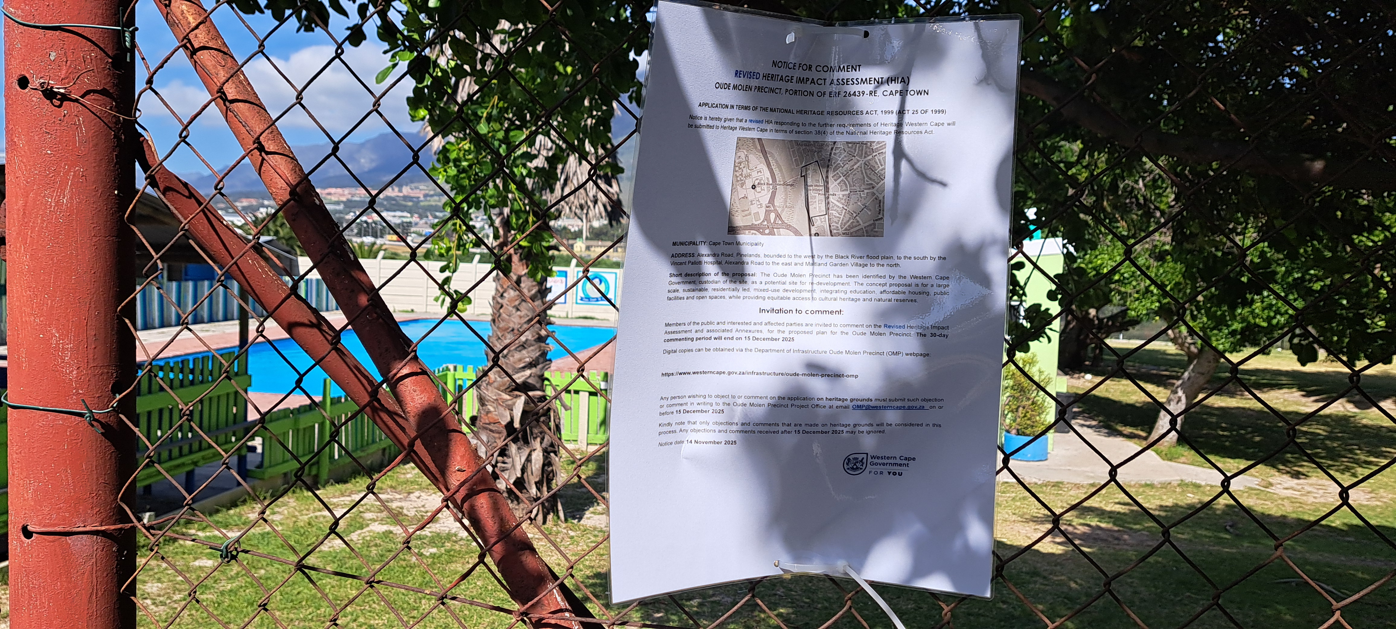 Any person wishing to object to or comment on the application on heritage grounds must submit such objection or comment in writing to the Oude Molen Precinct Project Office via email OMP@westerncape.gov.za on or before 15 December 2025.