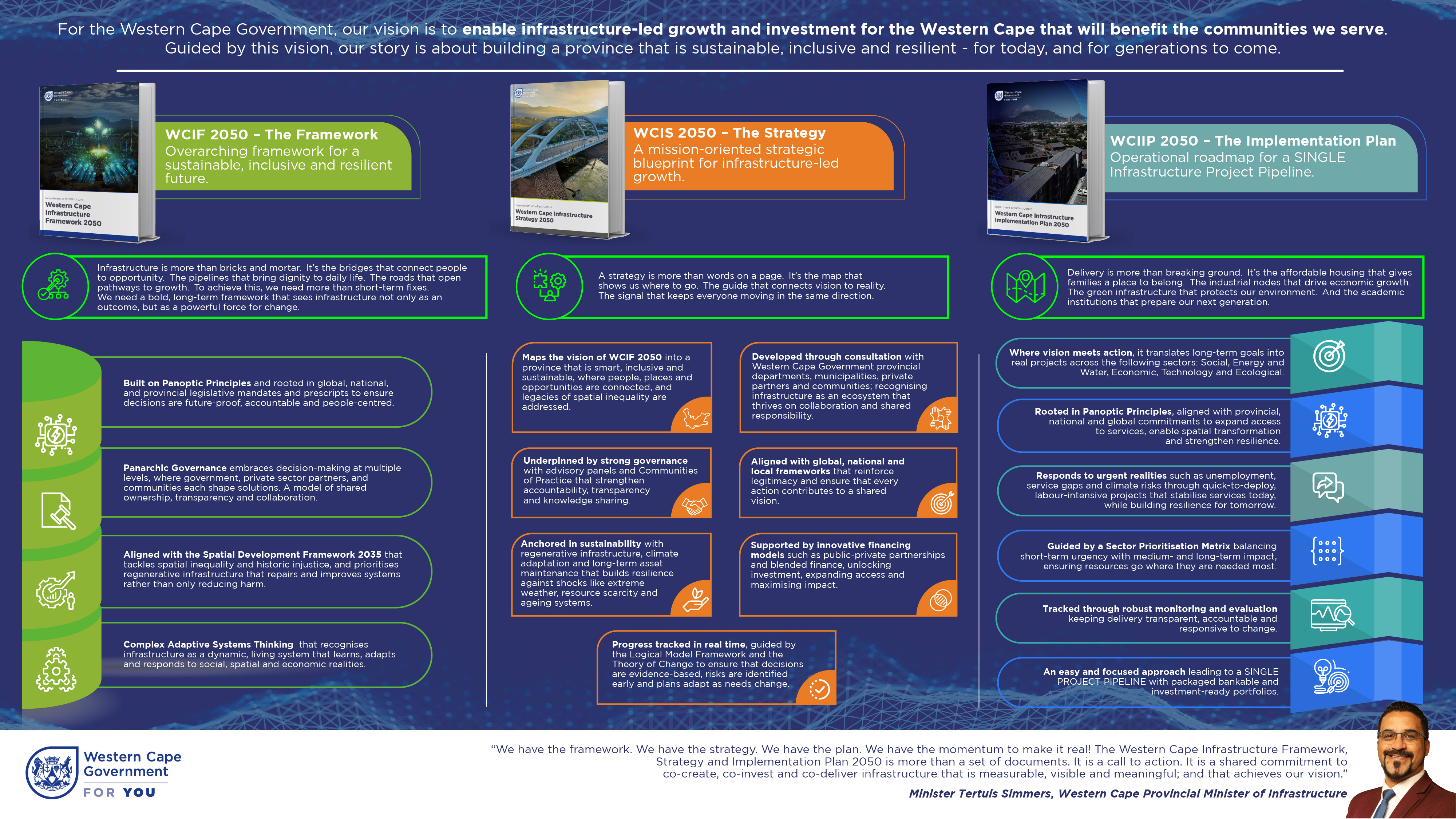 Guided by self-regulation through the application of Panoptic Principles , the WCIF 2050 emphasises transversal governance, public value and innovation, ensuring that infrastructure decisions are future-proof, accountable and people-centred. These principles are rooted in global, national and provincial strategies, and align with government’s commitment to inclusive growth, ethical leadership and climate resilience.